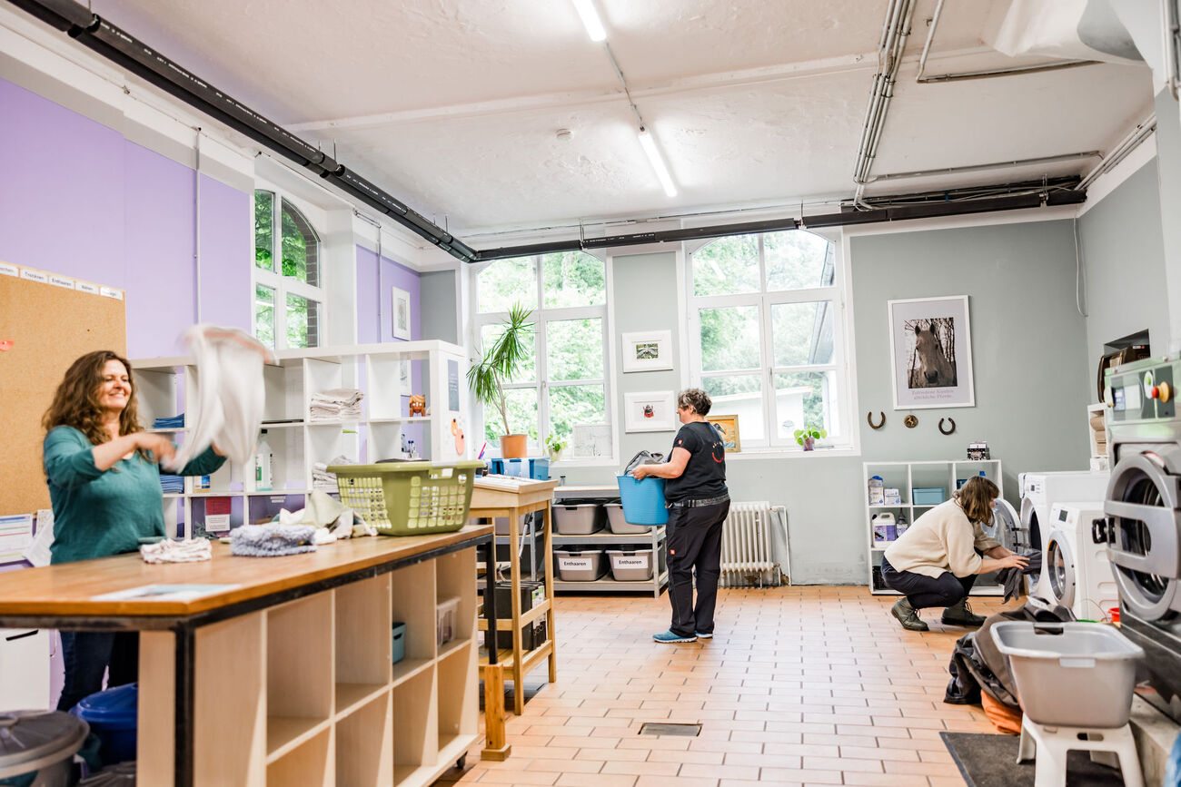 Unsere professionelle Pferdedeckenreinigung richtet sich an Pferdeliebhaber:innen, die mehr wollen als saubere Decken: Als Teil eines gemeinnützigen Sozialunternehmens schafft dieses Angebot inklusive Arbeitsplätze für Menschen mit körperlichen und/oder psychischen Beeinträchtigungen. Die Reinigung von Haustiertextilien, insbesondere von Pferdedecken, erfolgt sorgfältig, fachgerecht und umweltschonend in der hauseigenen Wäscherei.